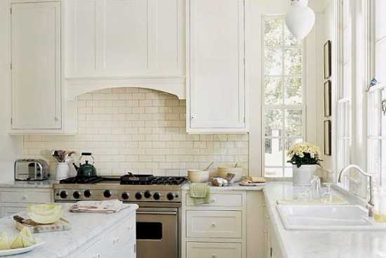 Конечно, выбирать кухонный фартук с декором под кирпич вы будете исходя из общей концепции кухни. Классический способ декорировать рабочую зону – использовать белоснежные изделия. Они могут быть выполнены как из керамики, так и из гипса. Белый фартук впишется и в интерьер прованса, и в интерьер кухни в стиле хай-тек. Но есть риск получить стерильное помещение, которое будет лишено изюминки. Выход есть: можно разбавить белоснежные кирпичики стеклянными вставками или выделить одну часть фартука для цветной мозаики или же пестрых кирпичей. Отлично будет, если цвет кирпичей будет перекликаться с цветом штор, обивки стульев или оттенков зоны отдыха.