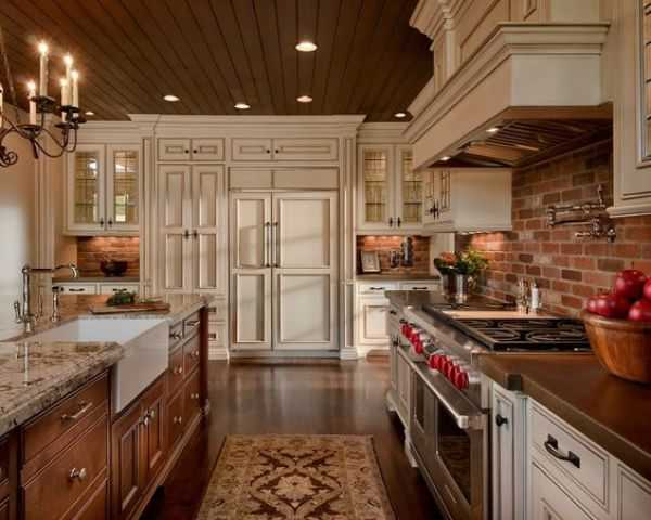 Внимания заслуживает и кирпичная кладка, выкрашенная в белый цвет основательно. На её фоне винтажная посуда и диковинная кухонная утварь прошлых столетий будет смотреться особенно органично.