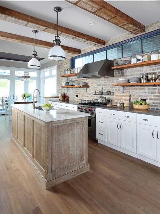 Ниже представлен ещё один оригинальный вариант кухонного дизайна. Его основные компоненты — белоснежная мебель, столешницы из светлой древесины и полноразмерный фартук, облицованный винтажным красным кирпичом.