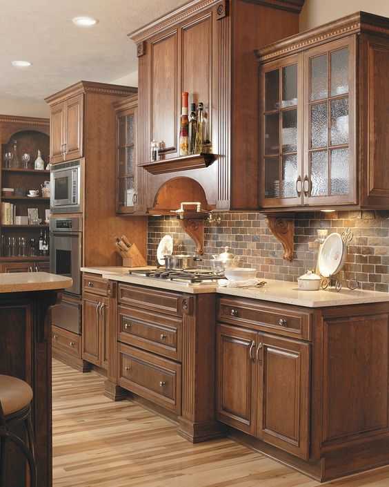 Плитка на фартук кирпичиками очень часто используется натурального цвета. Нежная кофейная «состаренная» плитка на фартук под кирпич идеально впишется в кухню в стиле ретро.