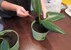 Когда фикус достигает больших размеров, его высаживают в кадки и раз в три года меняют верхнюю часть почвы на треть. Очень важно правильно пересадить растение, для этого необходимо: