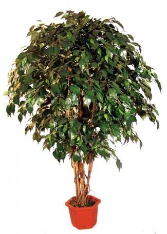 В домашних условиях чаще выращивают фикус Бенджамина. Это вечнозеленое деревце, вырастающие до 20 м (в дикой природе). Красивые зеленые листья отличаются гладкой поверхностью.