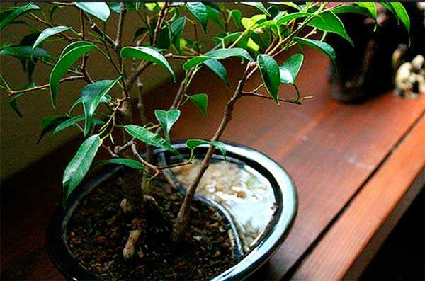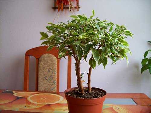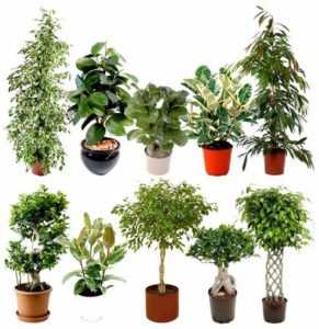 - Фикус Бенджамина. Существует несколько видов, они отличаются по цвету и форме листьев. Для придания растению нужной формы рекомендуется его регулярно обрезать. Подходит для выращивания как бонсай.