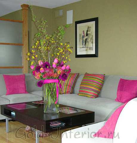 А что же такое добавить, чтобы не испортить получившуюся картину? Это очень просто. Добавьте в ваш дом, в интерьер вашей квартиры побольше цветов. Они могут быть какими угодно — цветущими или нет, в горшке или в вазе, сухие или же искусственные, а лучше всего живые. Выбор на прямую зависит от вас. Внеся цветы в интерьер вашей квартиры, вы его оживите, добавите тем самым положительные эмоции.