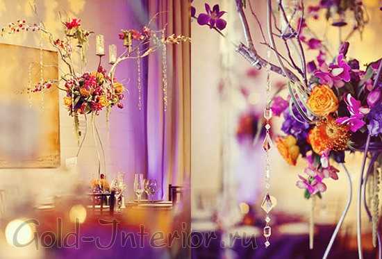 - Новое волшебство. Сказочная атмосфера в этом году выражена фиолетовыми цветами – сиренью, лавандой, ирисами, гортензиями, каллами. Для создания мистической мерцающей пыльцы такие композиции украшают стразами и серебристыми блестками, делая похожими на ювелирные украшения. Цветы этой гаммы нужно комбинировать с голубыми и зелеными оттенками.