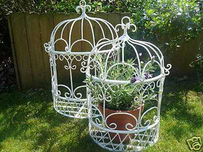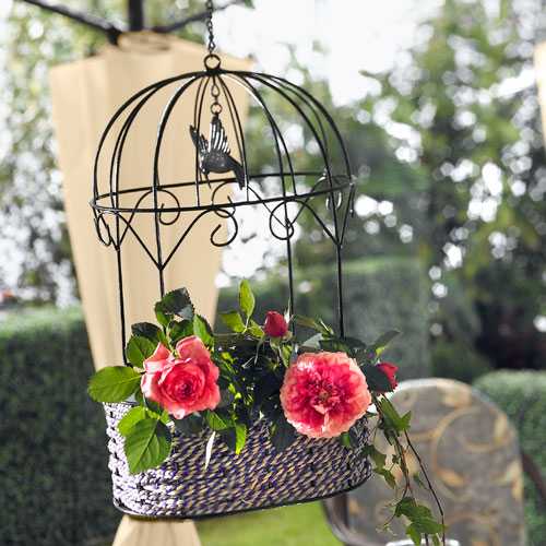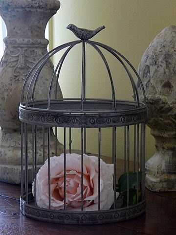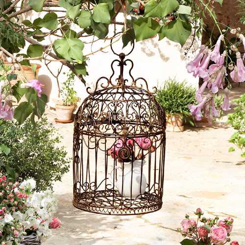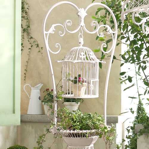 Отличный вариант украсить сад иди дачный участок. Обратите внимание: клетка не цельная, задней стенки в ней нет, что облегчает использование клетки для установки в нее горшка с цветами, а так же упрощает процесс полива.