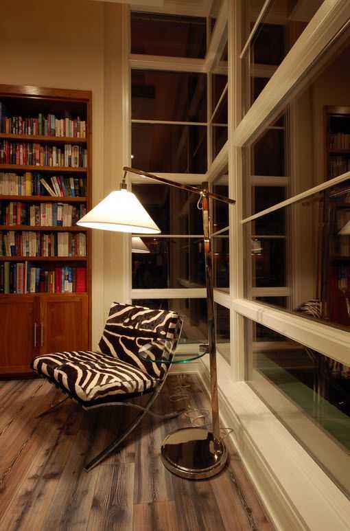 Напольное освещение будет смотреться довольно эффектно в тёмных помещениях. Главное расставить светильники рационально и пространство станет неузнаваемым, как на фотографии ниже.