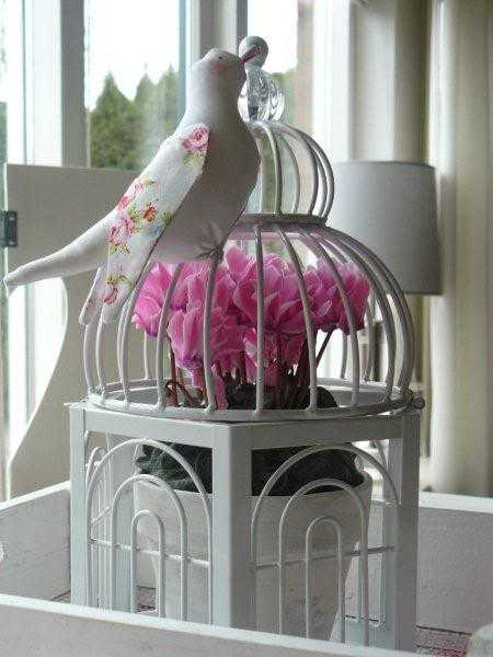 Композиция с живыми цветами на террасе. Для отделки самой клетки применили декоративную бечевку или шнур.