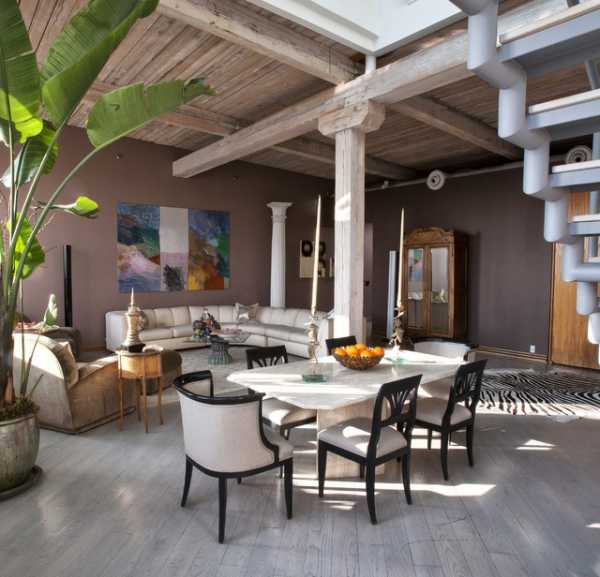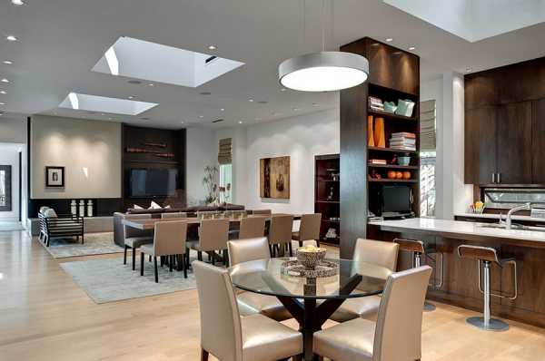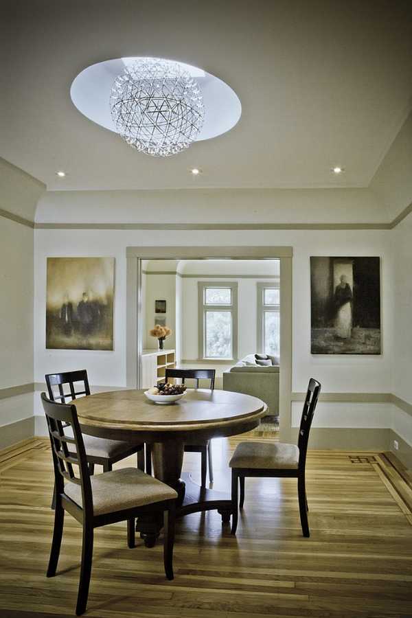 Простой и круглой застекленной крышей над обеденным столом можно не только красиво осветить площадку, но и визуально отделить ее от остальной части гостиной.