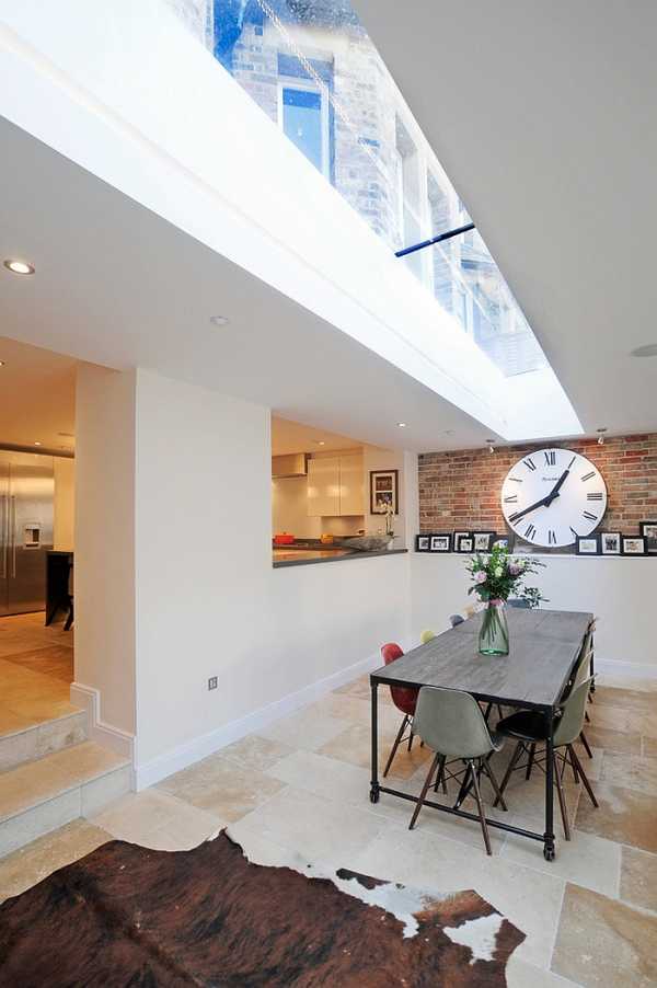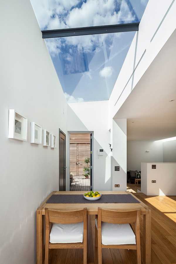 Добавление просвета в обеденный зал в этих домах приносит много естественного света, усиливает визуальный эффект стеклянной стены и делает все это без изменения существующего фасада.