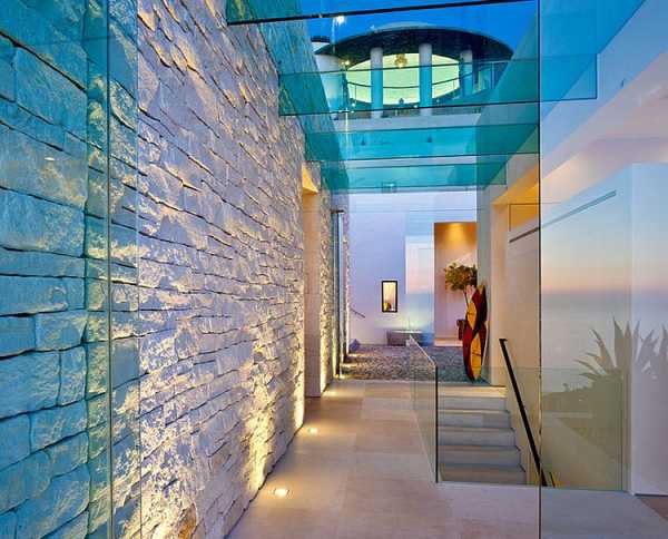 Надземное освещение на следующей фотографии является очень подходящим, подчёркивает текстурную красоту каменной стены и ее уникальность в современном пространстве, и при этом не кажется слишком подавляющим.