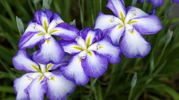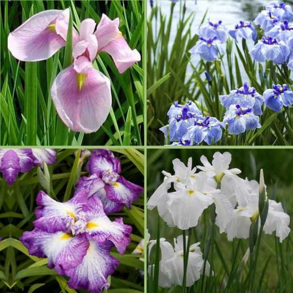 — Японские – их еще называют «мечевидные», они обладают пышными бутонами, которые в раскрытом состоянии достигают 25 см в диаметре. Цветовая палитра пестрит разнообразием. Например, сорт «Nessa-No-Mai» — белоснежные цветы с черными прожилками, «Сольвейг» выделяется фиолетовыми тонами, а сорт «Спуриа» включает ирисы самых разнообразных окрасок: лимонной, темно-фиолетовой, голубой и прочие;