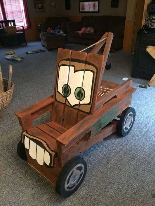 Отличная идея сделать стул в виде персонажа Метра машины из мультика «Тачки» . Этот стул Адирондак вы можете сделать и досок от поддона. Ниже вы можете ознакомиться с фото сделанных их разных ракурсов.