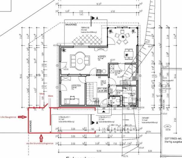 Далее вас ждет фотоотчет о строительстве дома, который по заказу клиента возводился одной немецкой фирмой. По меркам Германии все вышло довольно бюджетно, хотя всего было потрачено 180 тысяч евро.Первый этаж нарисовали так. Красным обозначен гараж.