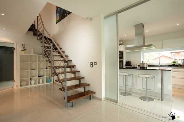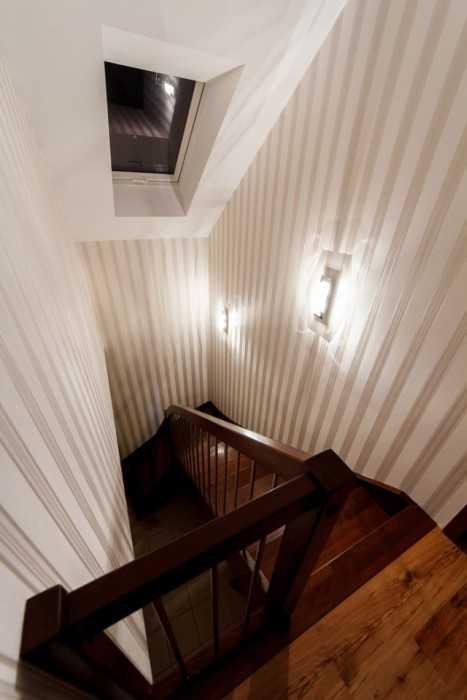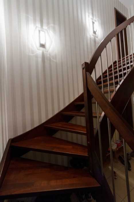 Для того, чтобы попасть на второй этаж, необходимо выйти в белоснежный холл и подняться по металлической лестнице с деревянными ступенями.
