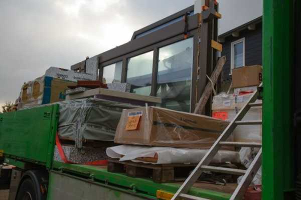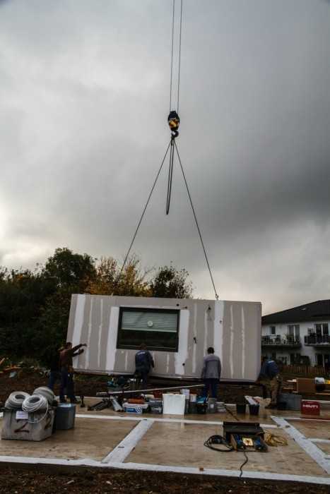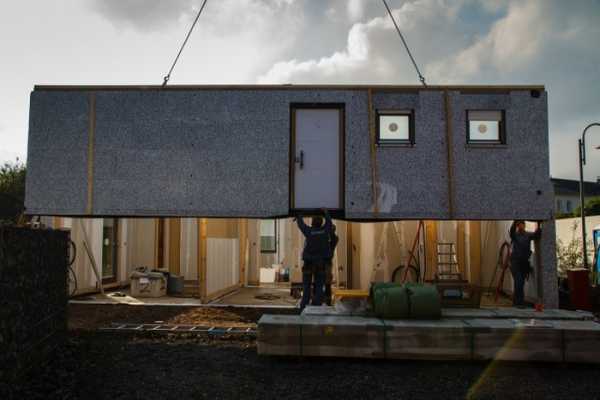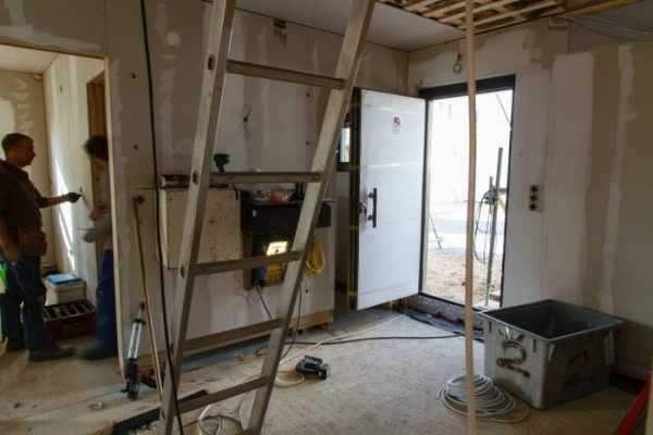 Стены приезжают готовые, уже с розетками, окнами и отделанные внутри гипсокартоном.