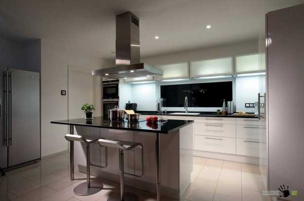 В кухонном пространстве также прослеживается современная стилистика с элементами стиля хай-тек. Высокотехнологичная кухня снабжена глянцевыми фасадами кухонных шкафов в светлых тонах и темными столешницами. Разноуровневая подсветка обеспечивает необходимый уровень яркости освещения рабочих поверхностей и функциональных сегментов кухонного пространства. Вместительный кухонный остров стал не только системой хранения с интегрированной варочной панелью, но и местом для завтраков, благодаря выступающей столешнице. Разместиться для короткой трапезы можно на оригинальных барных стульях из металлопластика.