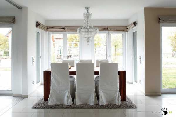 Для более длительных семейных трапез или устроения приему гостей с угощением, оборудована просторная столовая. На фоне белоснежной отделки помещения, залитого естественным освещением, особенно выигрышно смотрится внушительных размеров деревянный обеденный стол. Стулья с высокими спинками, облаченные в белоснежные съемные чехлы, составили компанию столу в организации обеденной группы. Завершает образ привлекательной столовой роскошная люстра с множеством стеклянных декоративных элементов.
