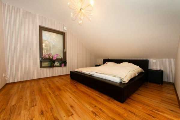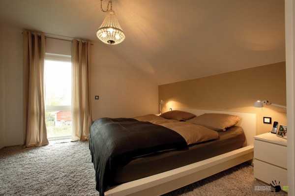 Переходим в личные комнаты и рассмотрим подробнее спальню, оформленную также в теплых природных тонах. И в комнате для сна и отдыха мы видим аналогичный дизайнерский прием в отделке – светлые потолок и стены встречаются с более яркой акцентной стеной. А вот напольное покрытие в спальне отличается всех ранее увиденных нами комнат – мягкий ковролин с длинным ворсом расположен по всей площади комнаты. Еще одной отличительной особенностью спальни от оформления других помещений стал декор окна – шторы на люверсах вместо римских, как это было в гостиной и столовой.