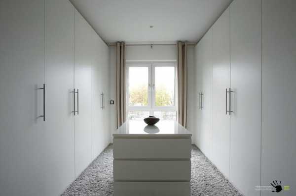 Рядом со спальней расположилась вместительная белоснежная гардеробная. Системы хранения в этом помещении выполнены в виде распашных шкафов, гардеробный остров составлен из выдвижных ящиков. Для создания удобной и комфортной атмосферы при подборе образа и примерке, для напольного покрытия был применен все тот же мягкий ковролин.