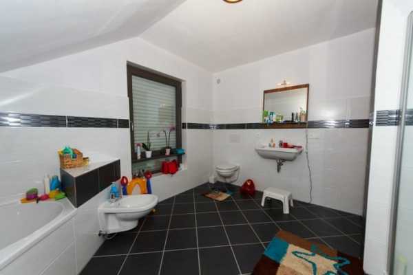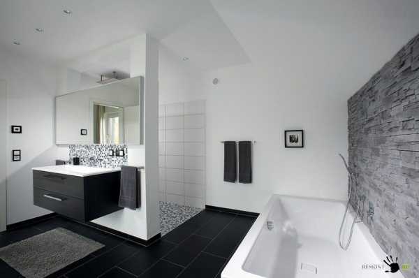 Также недалеко от спальни находится ванная комната с контрастным интерьером. Грамотное применением белого, черного и серого оттенков в оформлении ванной комнаты позволило создать динамичный, интересный образ комнаты для водных процедур. Использование комбинаторики различных отделочных материалов также внесло свою лепту в формирование интерьера – керамическая плитка, мозаика, стеновые панели и покраска в рамках одного помещения смотрятся гармонично и сбалансировано.
