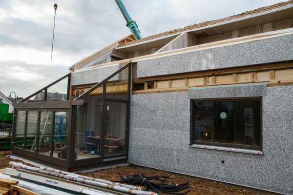 Важно! Благодаря современным технологиям монтаж фахверкового дома стал более доступным и менее трудоемким. Каркас помещения собирается из клееного бруса хвойных пород, а пустота в нем заполняется пенобетоном, ЦСП, сэндвич-панелями и другими видами утеплителей.
