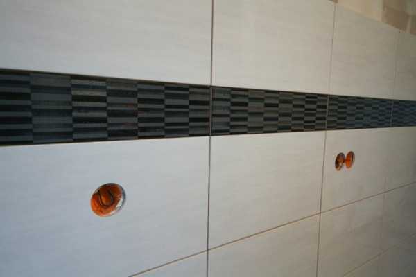 Использование мозаичной плитки в спектре цветов от черного до белого, не только разнообразило внешний вид ванной комнаты, но и обеспечило надежное, влагостойкое и долговечное покрытие самых нагруженных стен.