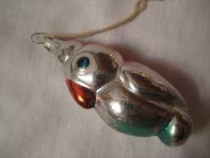 Ну и напоследок — послевоенный раритет. Тогда делали игрушки из накрепко заверченной, проклеенной и окрашенной ваты. Жаль, у меня сохранилась только одна, были еще фрукты.