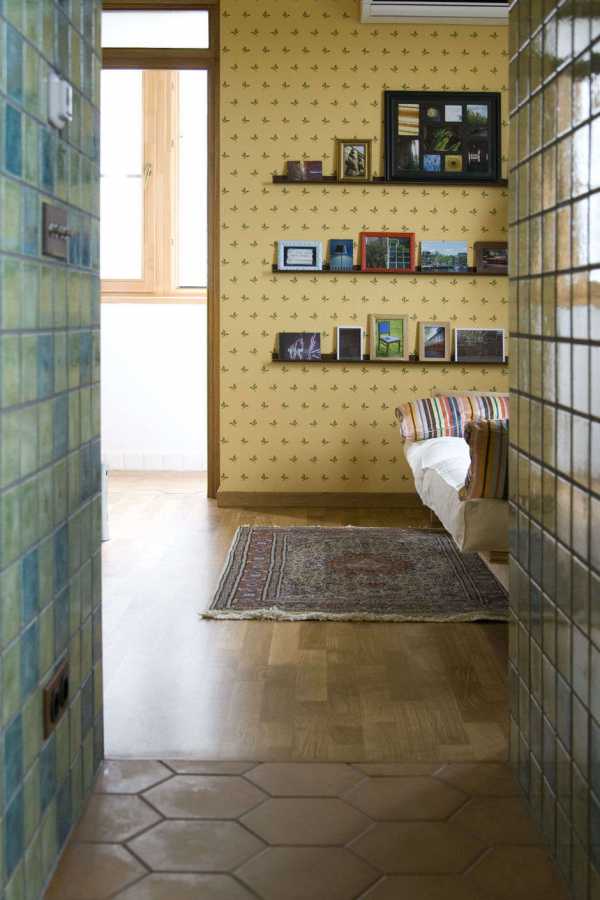 Любящий укромность хозяин новой архитектурой остался крайне доволен. Пришла пора задуматься об отделке и мебели. Как мы с вами понимаем, перепланировка квартиры с частичным демонтажом и последующим укреплением несущих конструкций, возведением стен — дело и небыстрое, и недешевое. Так как бюджет всегда ограничен, было принято решение вложить основную его часть в архитектуру пространства и отделочные материалы (паркет, плитка, окна и подоконники из массива лиственницы), результат вышел очень оригинальный и качественный. Пространство получилось поделенным на секторы при помощи отделки стен и полов. Шестигранная плитка на кухонном полу и на полу лоджии не простая, а кислотоупорная (отечественное производство и небольшая стоимость), ее предназначение — защищать полы лабораторий и заводских цехов, но ребята заметили, что именно она органично дополнит проект и с трудом уговорили поставщиков продать ее им в таком небольшом количестве. Полы комнат украшают шикарные дубовые паркет и плинтуса.