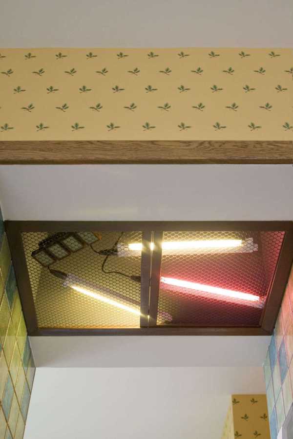 Еще интереснее решился вопрос с освещением в маленьком коридорчике, ведущем из кухни в гостиную, который образовался после возведения стенки для холодильника. Укрепление несущей конструкции не позволяло продлить этот проем на полную высоту потолка (что, конечно, было бы замечательно). Тогда архитекторы пошли от противного — занизили потолок в этом небольшом коридорчике, разместив сверху люминесцентные светильники и старые электронные часы за сеткой, получилась своеобразная инсталляция. Теперь она показывает время, подсвечивает коридор в экономном режиме даже ночами, а когда к хозяевам приходят гости, создает интимную атмосферу вечеринки.