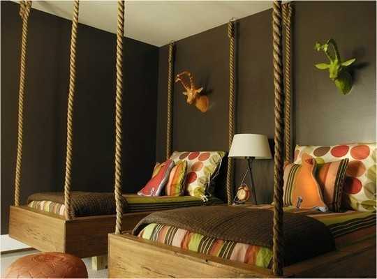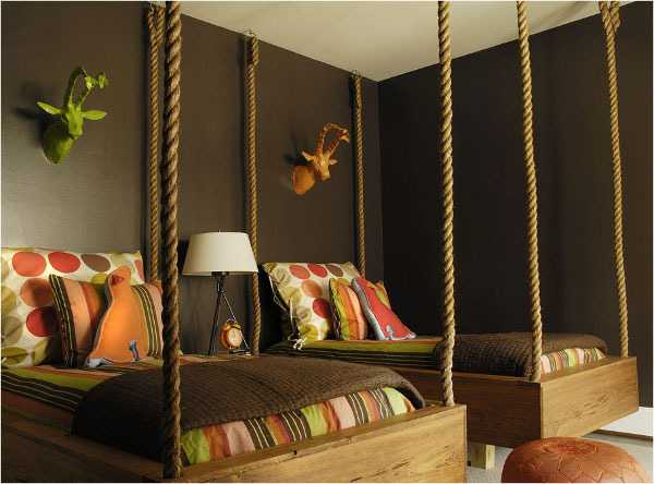 Если вы хотите создать совершено другой вид спальни, самый простой способ это использование каната. Вы можете как бы подвесить кровати к потолку ,что добавит воздушности и пикантности в интерьер.