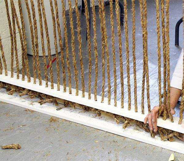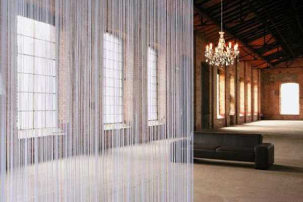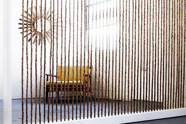 Для такой перегородки нужно в двух одинаковых по длине планках сделать дырки. В верхнюю планку вставляются канатные нити, после чего она крепится к потолку. А нижняя планка крепится на нити и либо остается висеть и получается подобие шторы, либо крепится к полу и создается ощущение стены. Чем меньше расстояние между нитями, тем плотнее перегородка.
