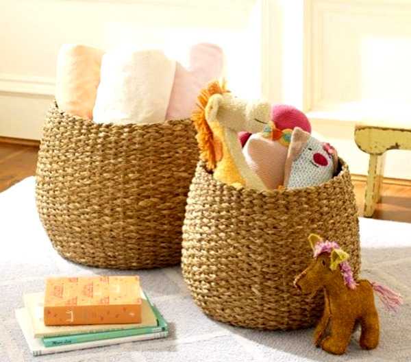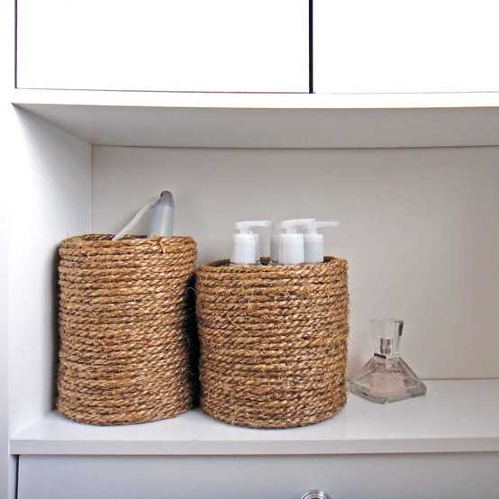 И это не предел. Такие вещи выглядят более объемно и фигурно. Очень часто канатами декорирую предметы ванной комнаты. Гармонично смотрится коврик для ванной и корзина для белья из одного материала. На даче, где в интерьере использовано много дерева, канаты, шнуры и веревки только добавляют уюта и теплой атмосферы.