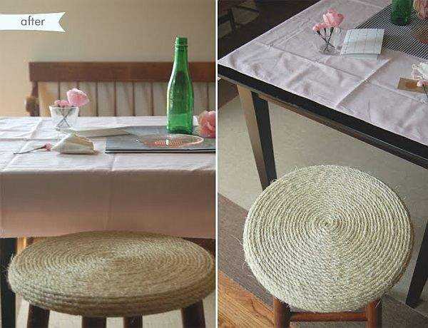 Этот проект настолько прост, но имеет захватывающий результат. Все, что нужно для перевоплощения стула, это некоторые метров веревки и клеевой пистолет. Сначала вам нужно удалить подставку для ног с табурета. Затем окрасьте черной аэрозольной краской , прежде чем украшать канатом (это не обязательно). Вам понадобится около 15 метров веревки для каждого стула. Используя клеевой пистолет оберните веревку вокруг ног и сидения стула.