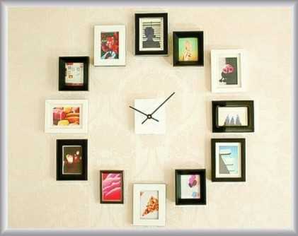 Часы или зеркало на стене так же можно обыграть фотографиями. Причем, обрамляя часы, лучше всего брать рамки разных размеров и использовать их определенным образом. Большие рамочки следует расположить напротив цифр 3, 6, 9 и 12. А рядом со всеми остальными цифрами нужно повесить рамки меньшего размера.