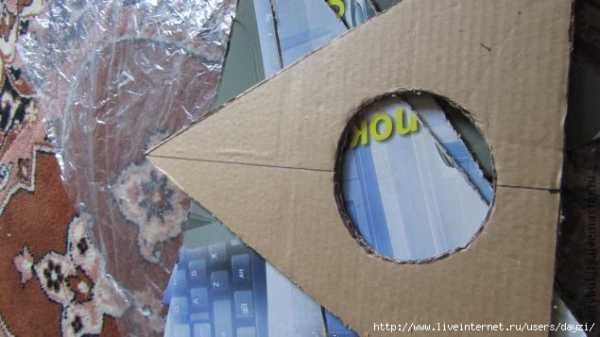 Каркас для палатки делаем из картона, вырезая 4 равнобедренные треугольника с основанием и высотой 50 см, при этом в одной из деталей нужно вырезать круг для будущего входа в домик, как на фотографии: