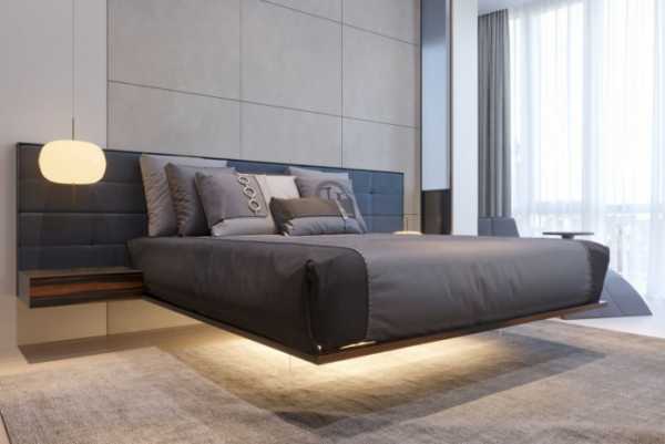 На фото парящая двухместная кровать с подсветкой с мягким низким изголовьем в интерьере спальни в современном стиле.