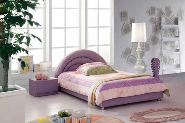 На фото спальня для девушки и кровать закругленной формы с темно-фиолетовым изголовьем.