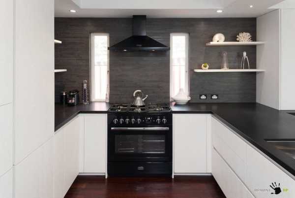 Даже кухню скромных размеров можно оборудовать с помощью п-образной планировки. Безусловно, в этом случае речь не идет об установки обеденной зоны или кухонного острова. Чтобы придать динамизма кухонному гарнитуру, можно использовать контрастные сочетания цветов. Самая распространенная комбинаторика – сочетание белого с черным. Темные фасады шкафов и светлый мрамор столешниц придадут благородства даже скромной кухне.