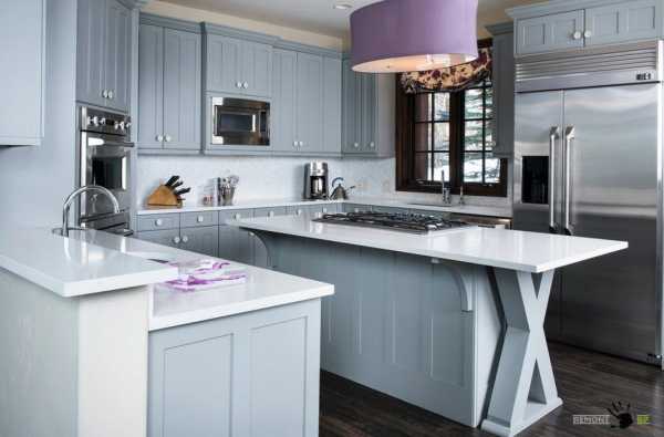 Серо-голубые фасады кухонных шкафов и глянцевые белоснежные столешницы смотрятся очень нарядно, но при этом не «режут» взор броскими сочетаниями колористы утверждают, что подобные цветовые решения способствуют снижению аппетита – для хозяек, которые вечно сидят на диете подобные методики воздействия на собственную психику могут пригодиться.