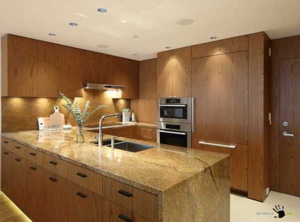 Вместительные кухонные шкафчики, расположенные от пола до потолка, создают приятную, теплую атмосферу, благодаря окрасу «под дерево». Даже прохладная поверхность каменных столешниц вызывает ассоциации с теплом и все из-за песочно-коричневых оттенков. С помощью подсветки удалось осветить не только рабочие поверхности, но и нижний ярус полуострова у пола, создав ощущение подвешенности меблировки в пространстве кухни.