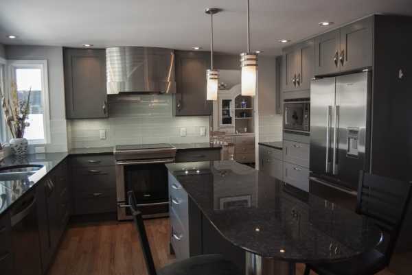 Симпатичный кухонный гарнитур в серых тонах П-образной формы.