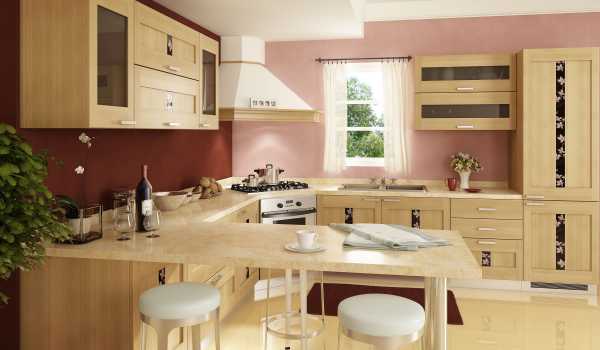 П-образный кухонный гарнитур лучше всего впишется в помещение средних и больших размеров. Это даст возможность расставить все элементы, мебель и бытовую технику и останется достаточно свободного пространства.