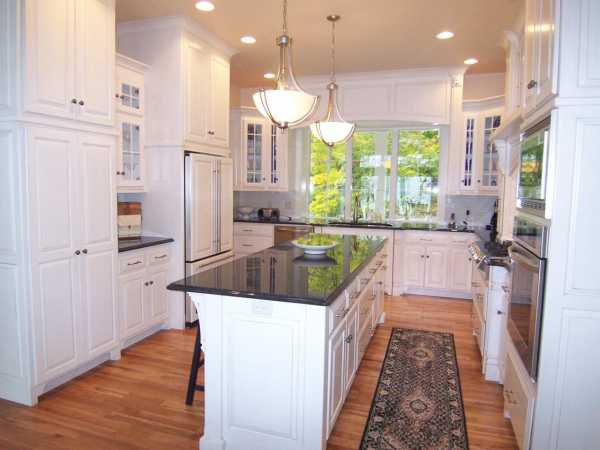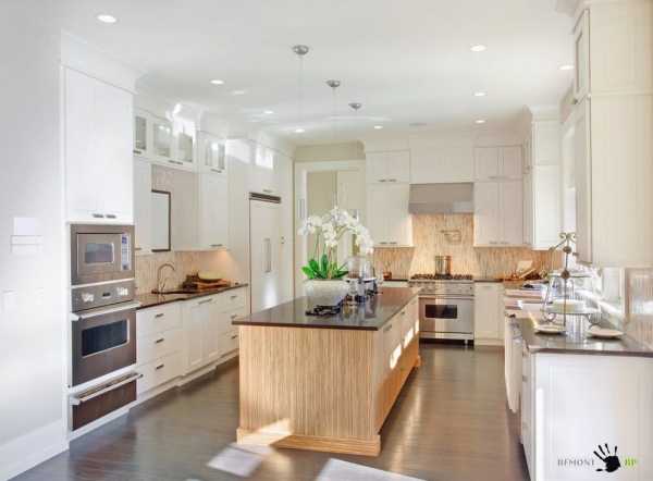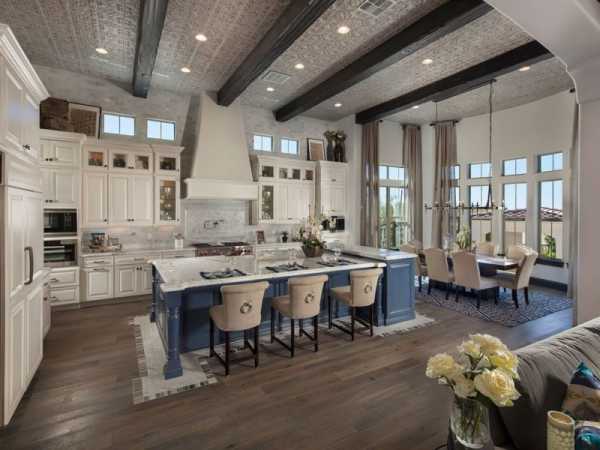 Классические фасады шкафов в белоснежном исполнении, вместительный остров с мраморной столешницей и роскошная люстра – классика на все времена для просторных помещений кухни. Практичная и рациональная, но при этом невероятно элегантная обстановка традиционной кухни способна влюбить в себя многих домовладельцев.