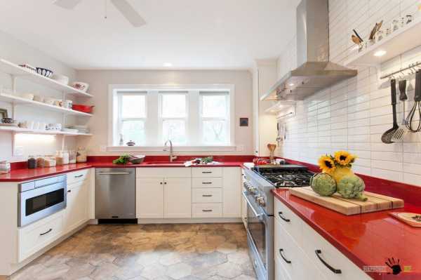 Контрастное сочетание яркого насыщенного оттенка с белым цветом – тренд в оформлении кухонных пространств последних лет. Белоснежные столешницы и ярко-малиновые фасады кухонных шкафов смотрятся эффектно, колоритно и насыщенно. Завершает незаурядный образ кухни блеск хромированных деталей интерьера, бытовой техники и мебельной фурнитуры.