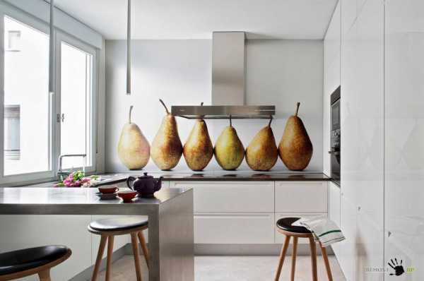 В качестве акцента в белоснежной кухне можно использовать поверхность кухонного фартука. Существует масса способов оформления плоскости над рабочими поверхностями – от керамической плитки или мозаики до стеклянных настенных панелей с фотопечатью.