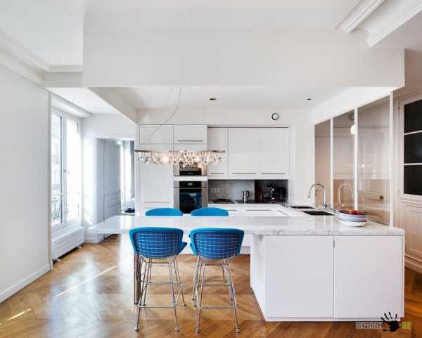 Белоснежные кухонные шкафы и мраморные столешницы – прекрасный с точки зрения эстетики и практичный с точки зрения эксплуатации и ухода альянс. Добавить к этой белоснежной идиллии яркий акцент, например барные стулья или колоритный фартук и современная кухня с универсальным интерьером, актуальным на долгие годы, готова.