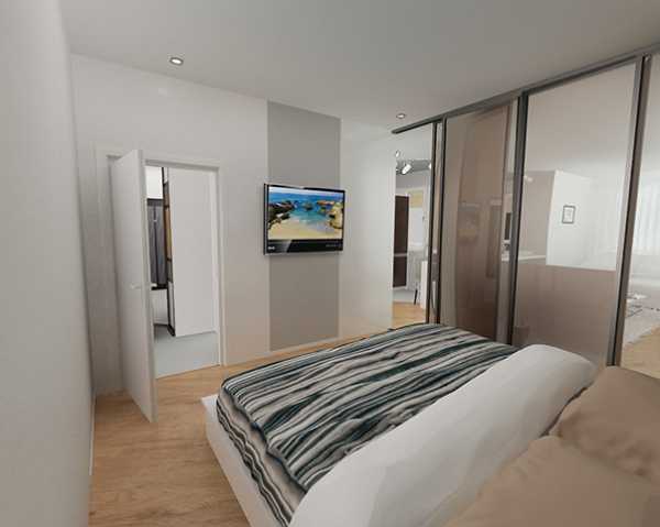 Чтобы комната казалась просторнее, используйте большое количество зеркал (например, зеркальный шкаф-купе). Поверхности из стекла также приветствуются.