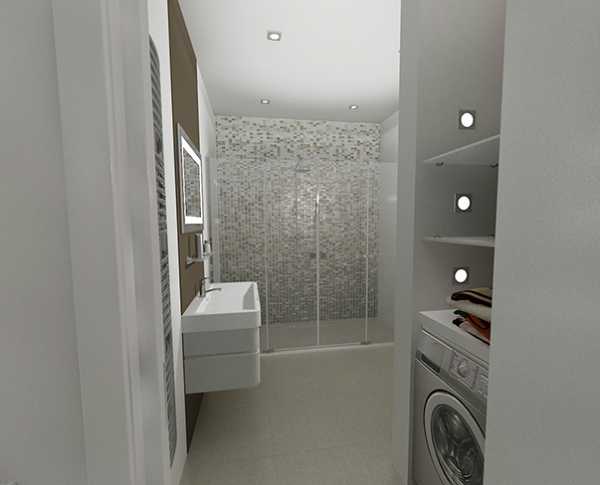 В первом варианте ванной комнаты часть помещения отведена под душевую зону со сливом в стене.
