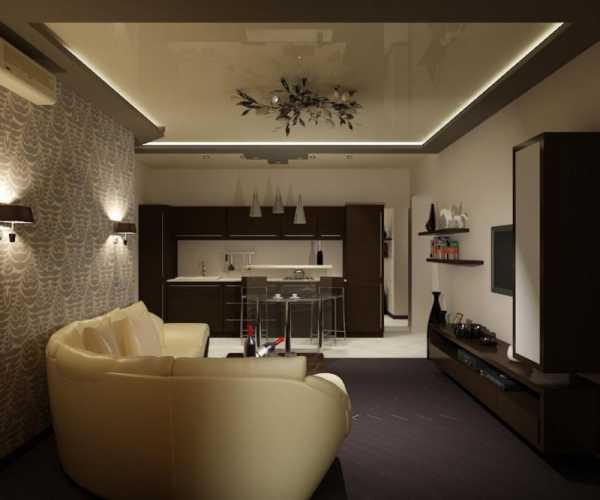 Потолок также можно оснастить различным освещением. Такая идея для однокомнатной квартиры-хрущевки является самой оптимальной, так как подходит для большинства и решает проблему маленького и слабо освещенного пространства.